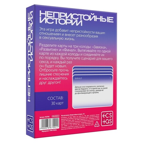 Разделите карты на три колоды: «Завязка», «Развитие» и «Финал». Вытягивайте по одной карте из каждой колоды и соединяйте их по порядку. Вы получите сценарий для вашего секса, и каждый раз он будет новым. Отбросьте прочь лишние стеснения и наслаждайтесь друг другом!
