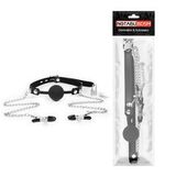 Оригинальный интимный аксессуар для любителей БДСМ-игр. Состоит из удобного ошейника с силиконовым шариком и металлических зажимов для сосков, соединённых с ошейником прочными металлическими цепочками. Также в комплект входит небольшой замочек, который придаёт дополнительный антураж.