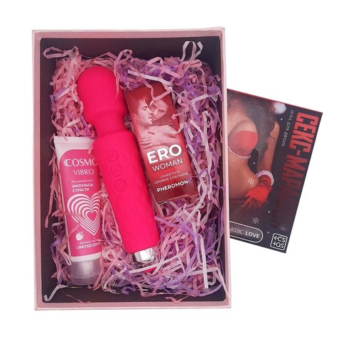 В наборе: вибратор, лубрикант с возбуждающим эффектом и с ароматом земляники, феромоны, новогодняя игра для двоих.